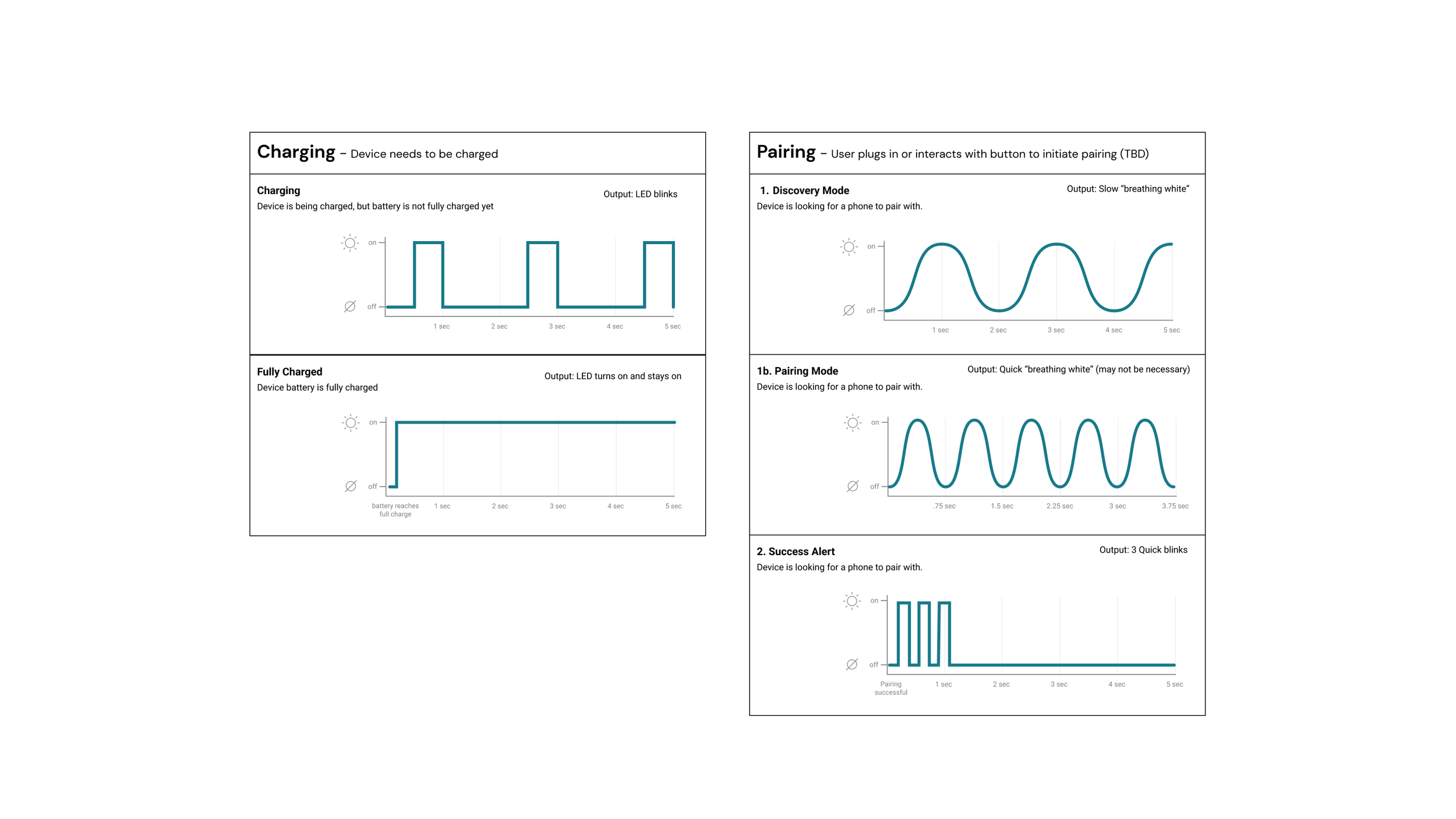 Users needed to understand how to pair their wristband device to the app. We specified and prototyped LED pairing states, which we vetted and refined with our engineering team.