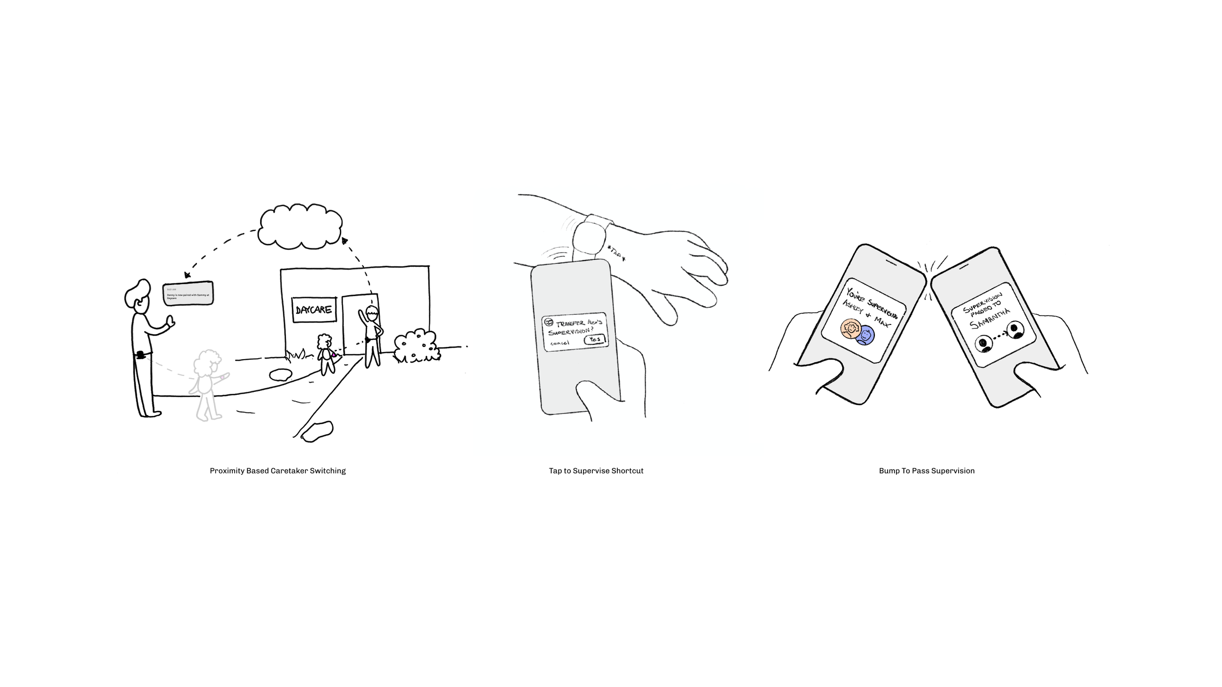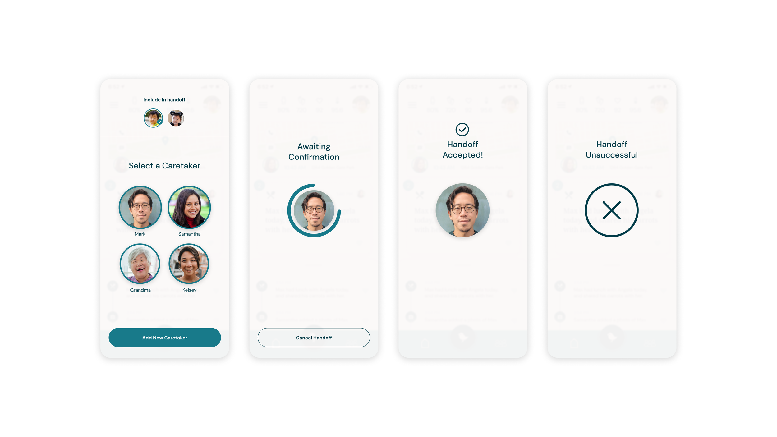 We developed a handoff feature to remove the guesswork out of changing caregivers. We included ample affordances to help parents and caregivers confirm a successful transfer of care, ensuring a higher degree of trust. This meant foregoing a “flashier” handoff interaction for a time-sensitive confirmation request. The result was less potential for confusion or accidental handoffs.