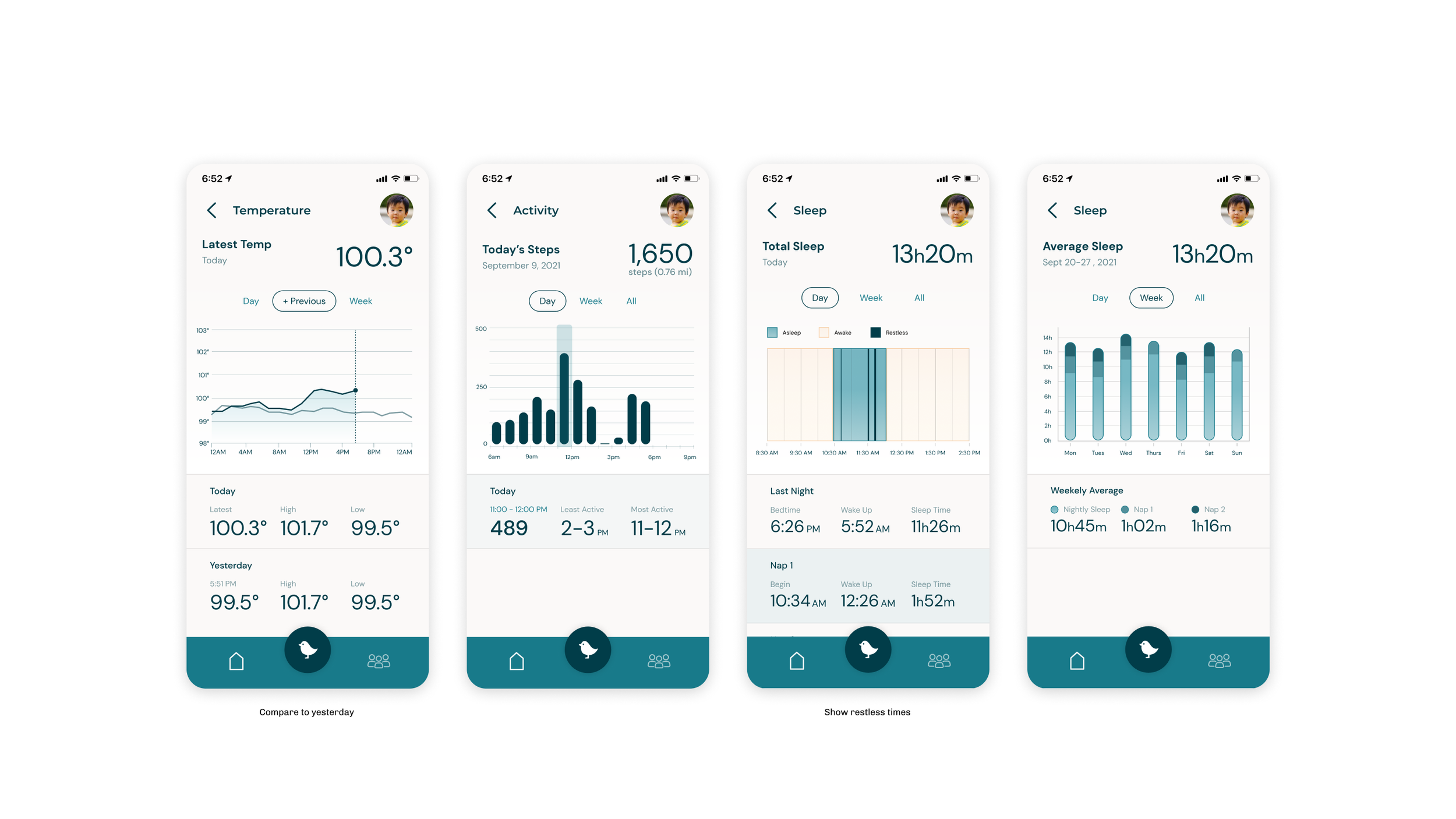 Based on insights from our discovery research with parents and caregivers, we defined features that put peace of mind at the forefront: easy hardware pairing, seamless handoffs and caregiver management, glanceable health data digests.